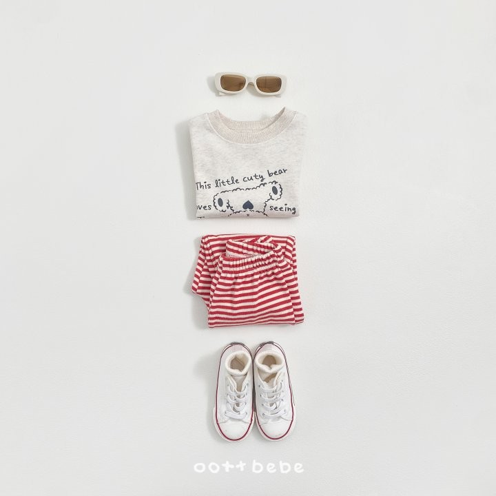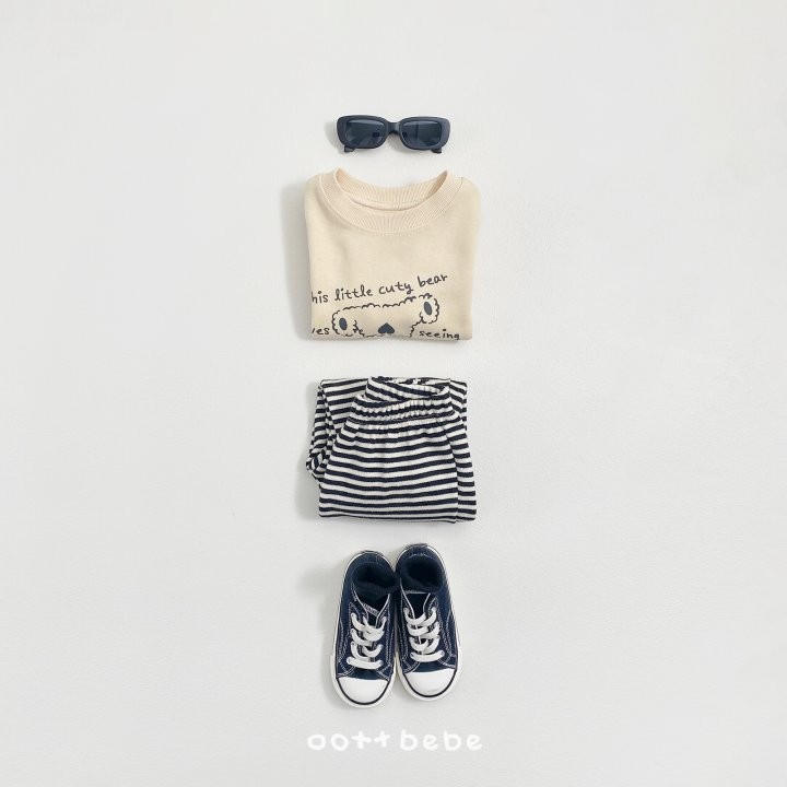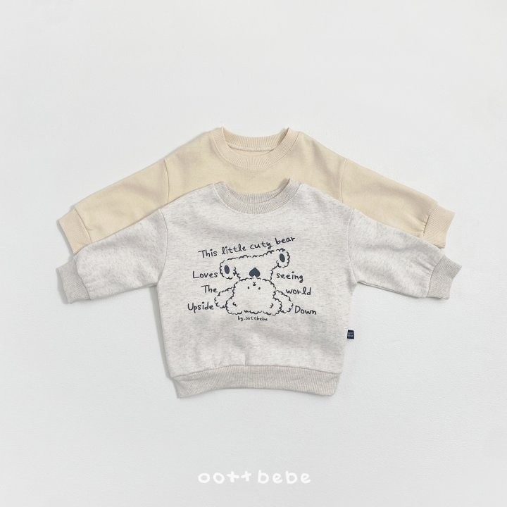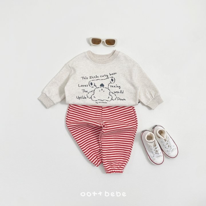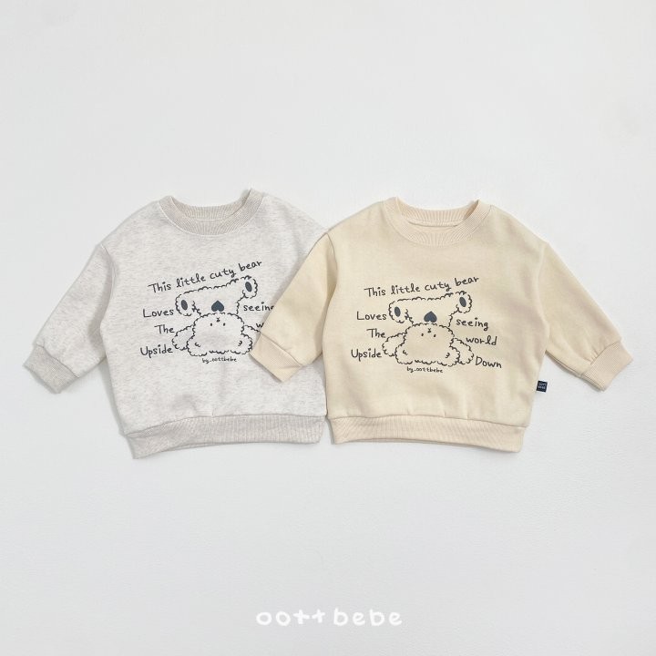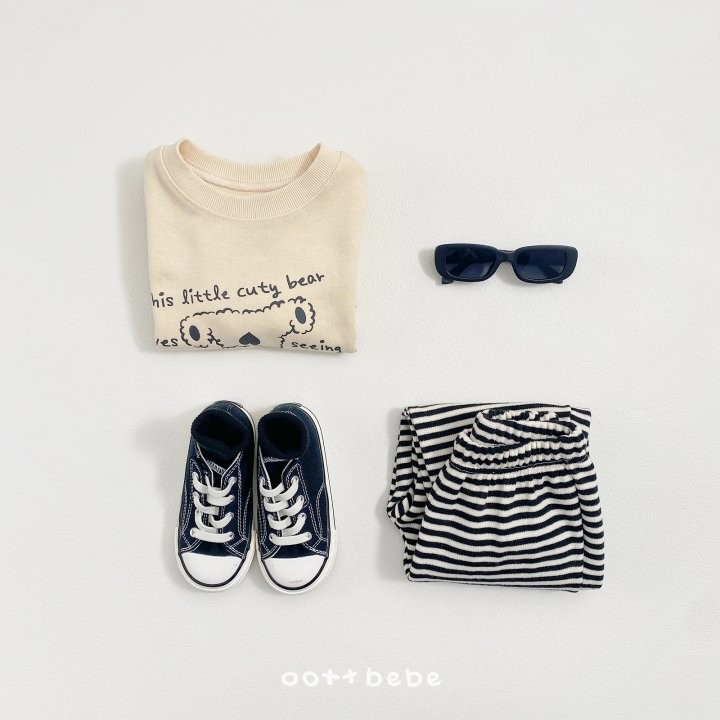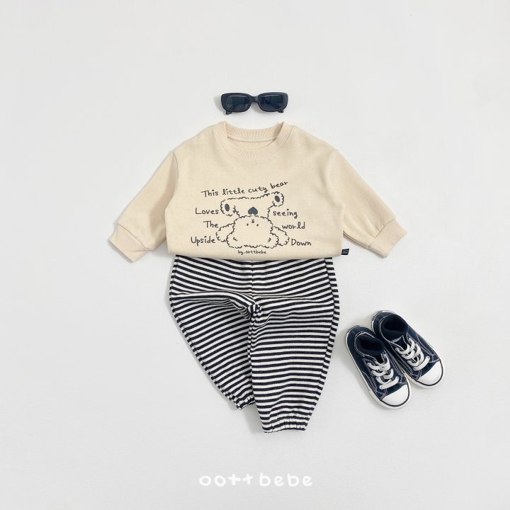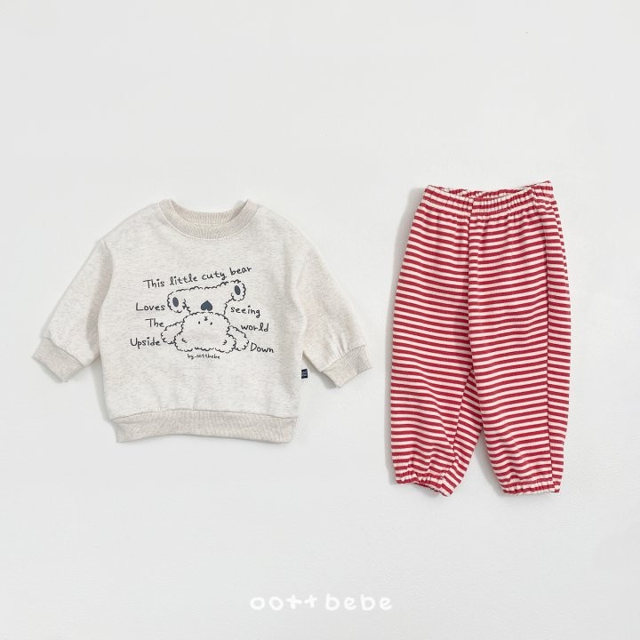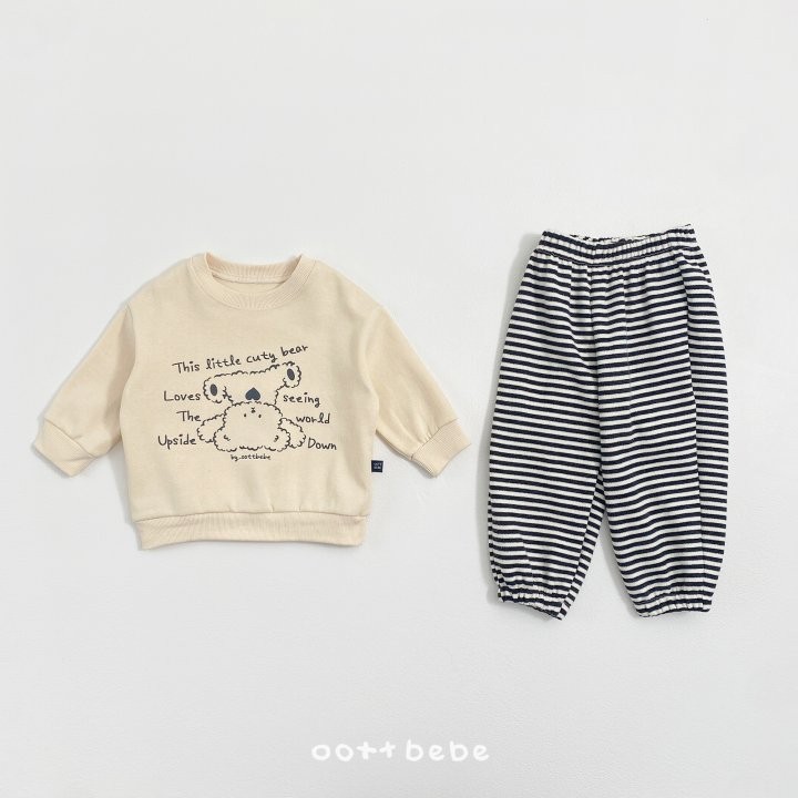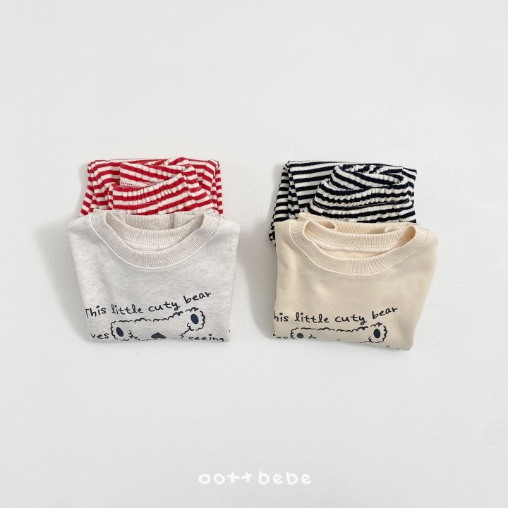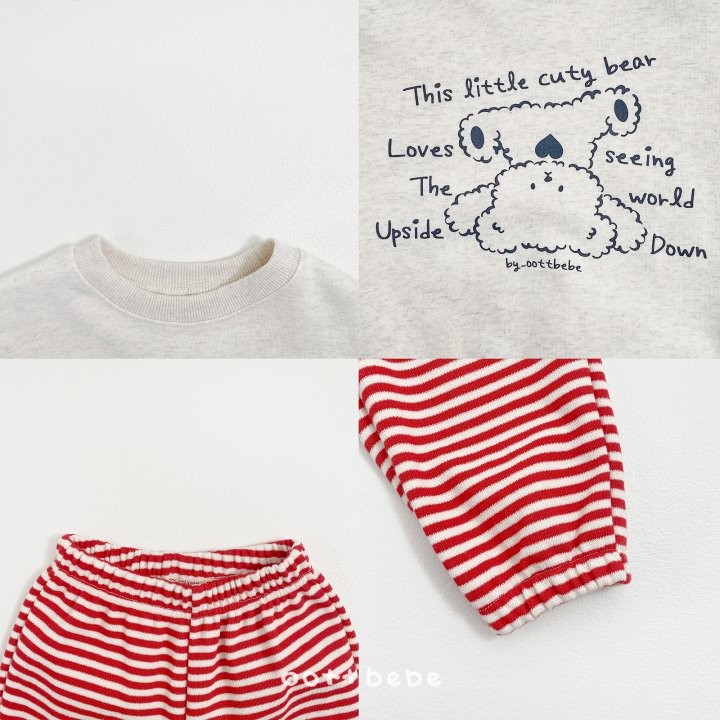 거꾸로 누워있는 오띠베어가 까꿍! 인사하는 사랑스러운 포인트의 까꿍상하복이에요.